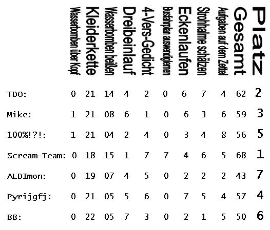 Sonntag, den 01.07.01: Die Messdiener St.Vitus Visbek bekommen ein einfaches Schwarz-weiß-Foto und müssen diesen abgebildeten Ort in Wustrow finden. Dort versteckt sich irgendwo ein Omi, der sich in seiner Umgebung anpasst. Wenn sie diesen Omi finden, bekommen sie eine Aufgabe. Nach ordnungsgemäßer Absolvierung der Aufgabe bekommen sie das nächste Schwarz-weiß-Foto, um einen weiteren Omi zu enttarnen. Damit dieses nicht zu schnell vorbei ist, müssen sie zusätzlich noch Aufgaben, die auf der Hinterseite der Fotos sind, lösen (hehe). Ein Kamera-Team war auch dabei, so dass ihr nach dem Lager, bei einem Nachtreffen sehen könnt, wie ihr euch blamiert habt. Genug geschrieben! Jetzt kommen wir zu den Ergebnissen: