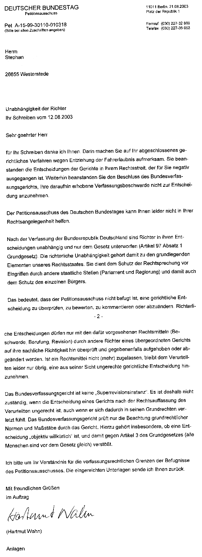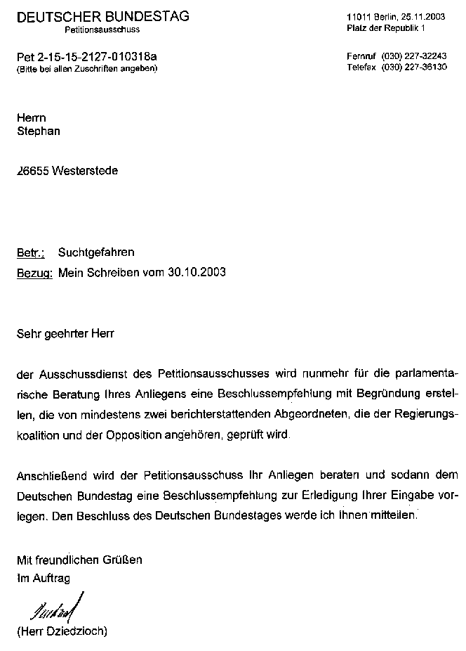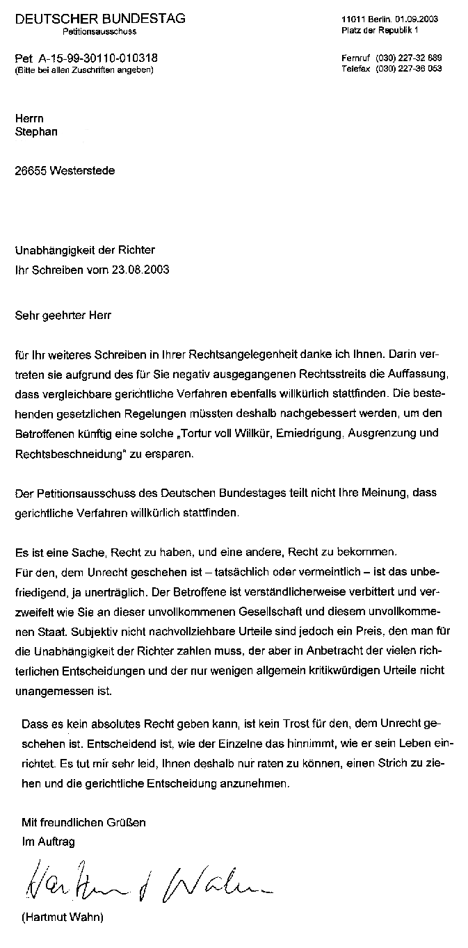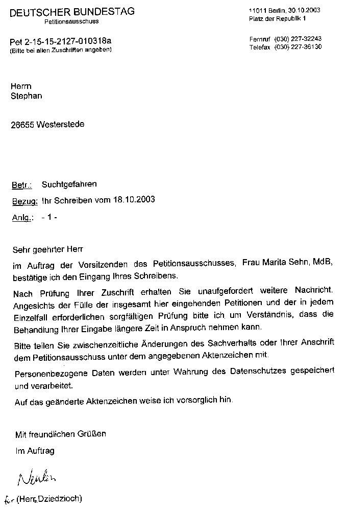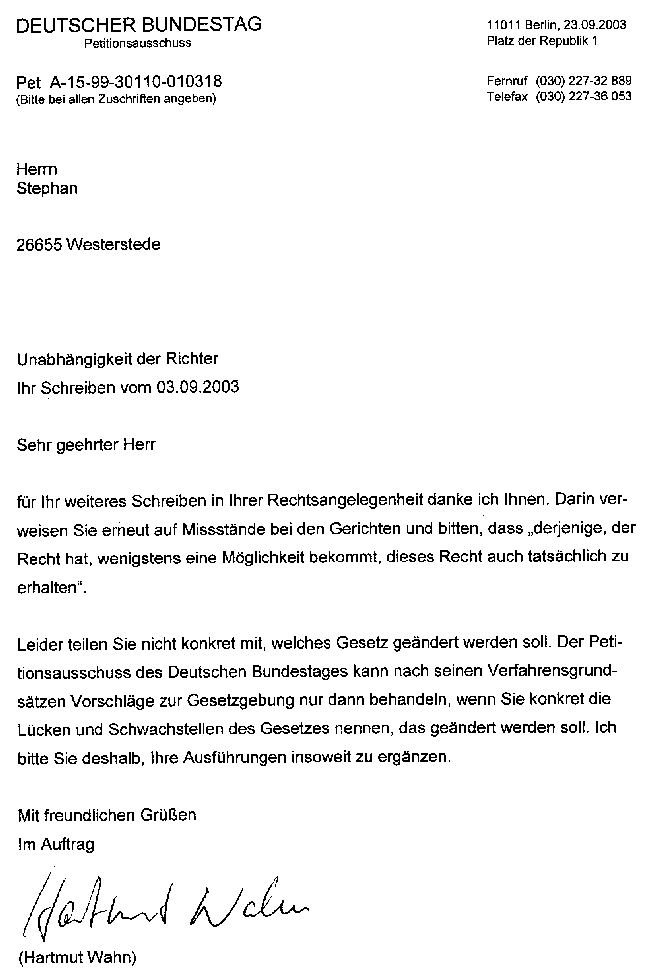 Erste Reaktion auf die Petition vom 21.08.2003