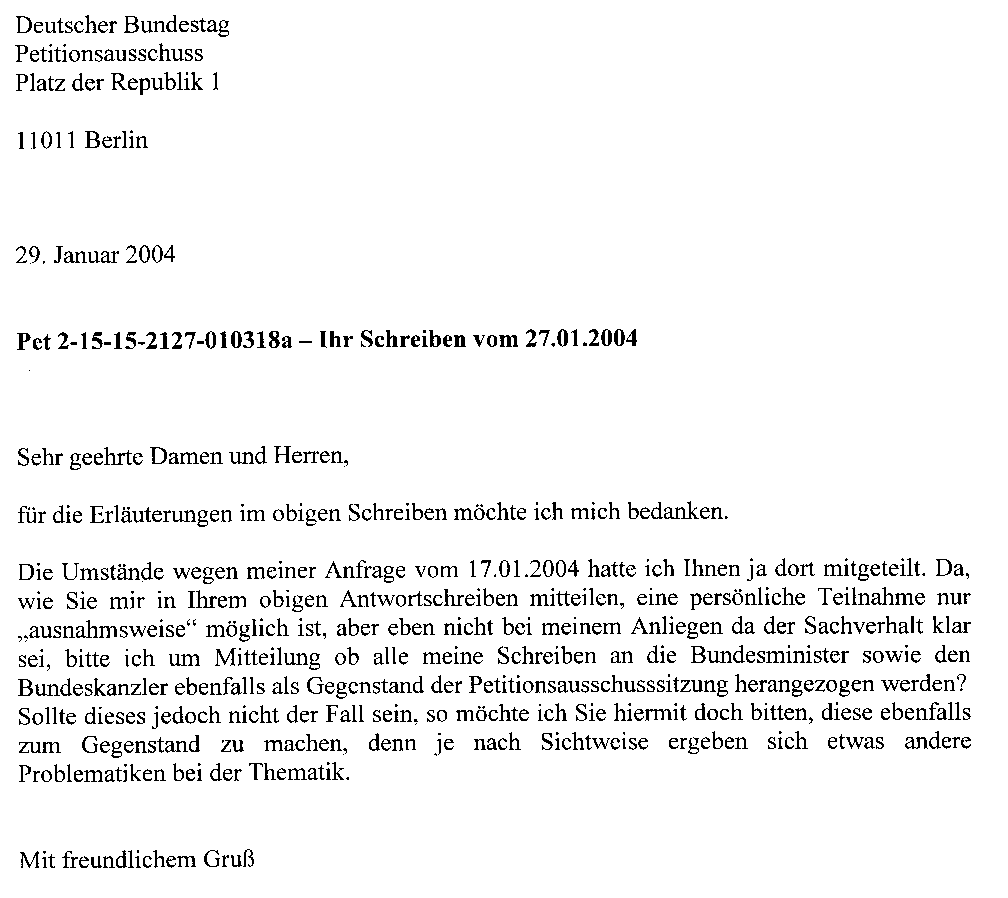 Anfrage, ob meine “Politikeranfragen” in dem Verfahren mit berücksichtigt werden, vom 29.01.2004