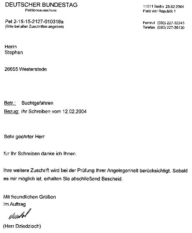 Mitteilung über den Eingang meiner Post vom 12.02.2004, sowie Bestätigung für die Berücksichtigung der Gleichen vom 25.02.2004