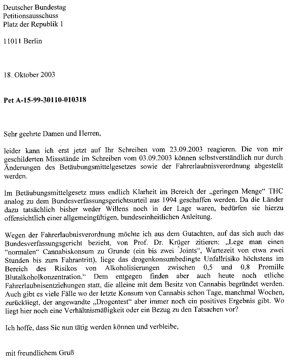 Aufgrund des Verlaufes des vorläufigen Rechtsschutzverfahrens in der Fahrerlaubnissache habe ich eine Petition an den Deutschen Bundestag gerichtet; nachfolgend der Schriftverkehr dazu.